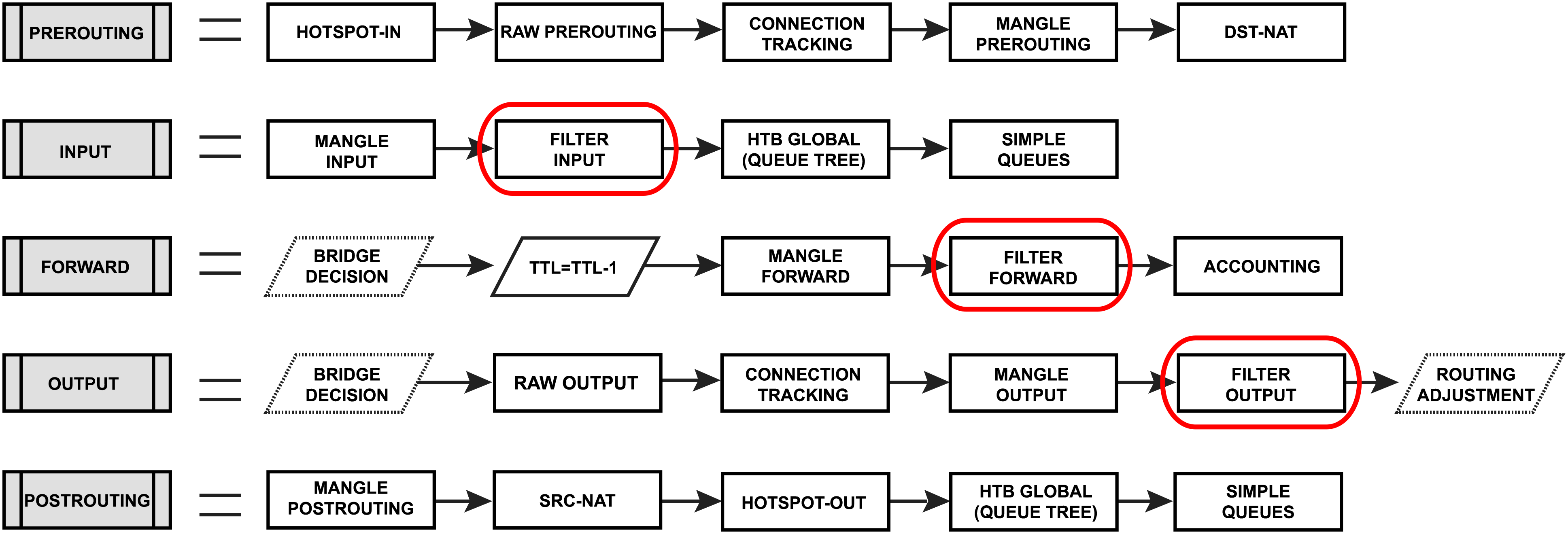 • input — используется для обработки пакетов, проходящих через один из интерфейсов с адресом назначения, который является одним из адресов маршрутизатора. Пакеты, проходящие через маршрутизатор, не обрабатываются правилами цепочки input (входящие на маршрутизатор).