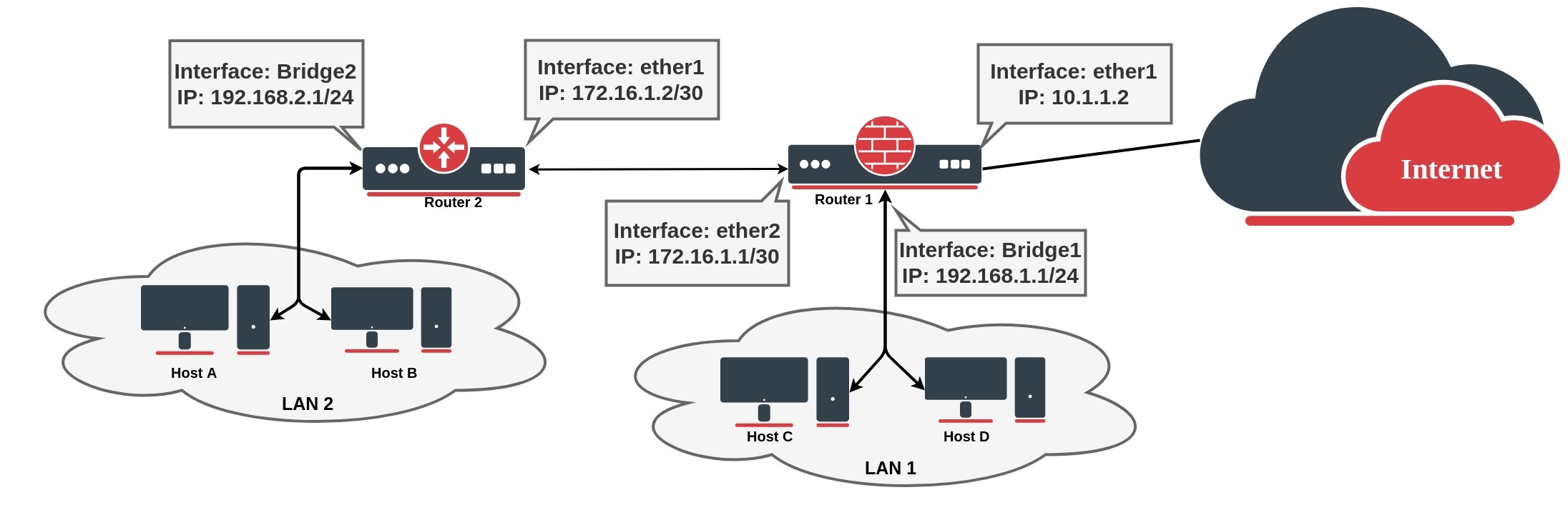 Теперь пакеты из LAN1 будут успешно пересылаться в LAN2, но на этом дело не кончается. Router2 не знает, как достучаться до LAN1, поэтому любые пакеты из LAN2 будут отброшены на Router2.