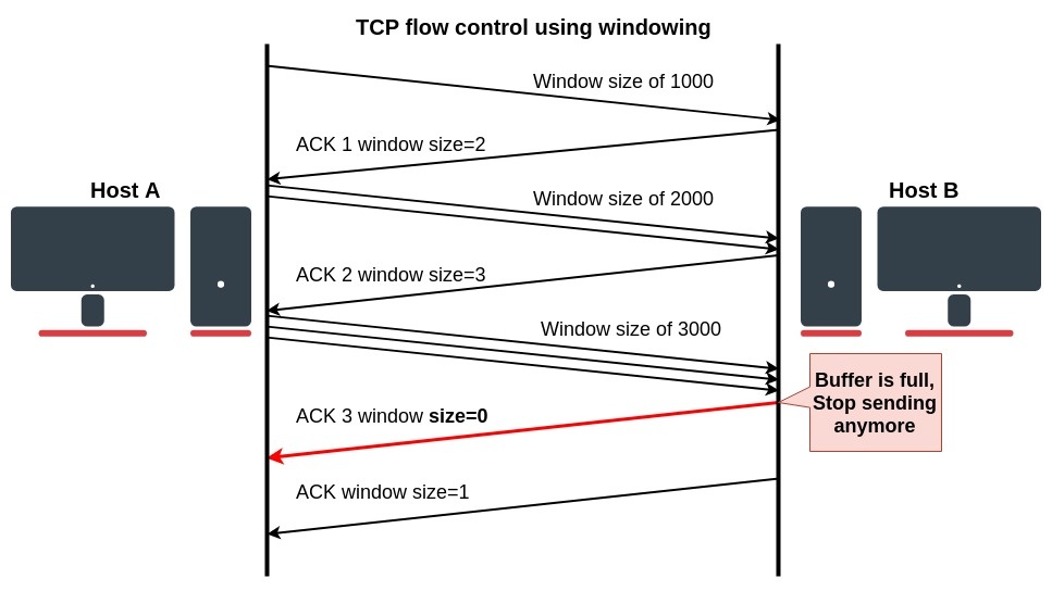 - Host B увеличивает окно до 3000, Host A отправляет три фрейма и ждёт подтверждения.