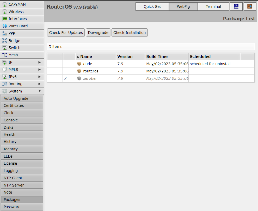 [admin@MikroTik] >/system package print