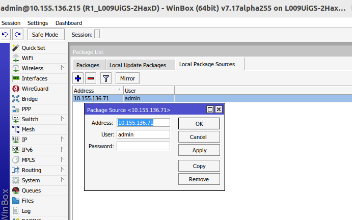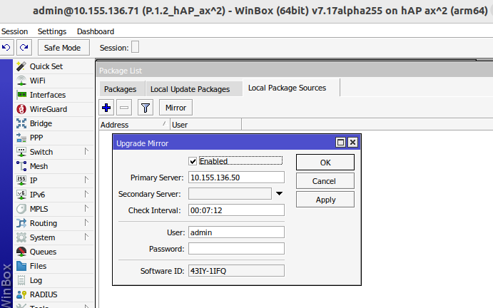 - Выберите локальные источники пакетов, включите Mirror device, укажите основной сервер с пакетами (например, 10.155.136.50). Минимальный интервал проверки можно установить на 00:07:12, когда устройство через WinBox соединится с основным роутером и проверит обновления;