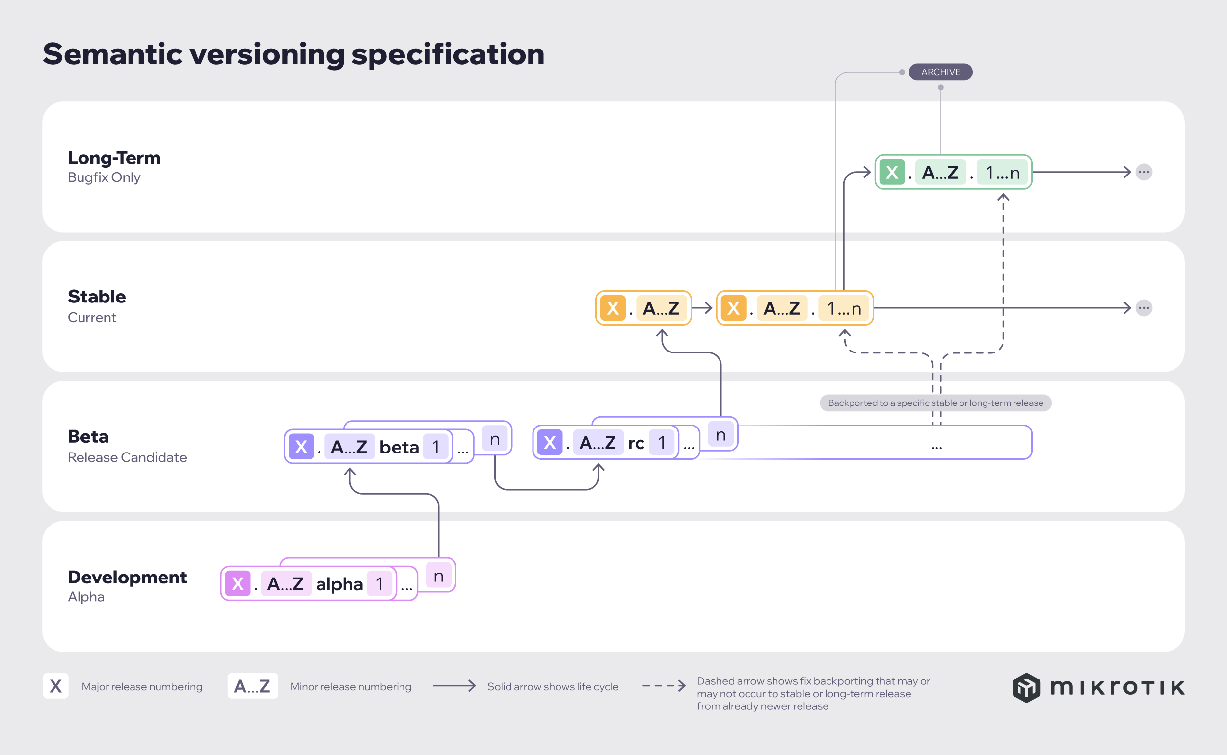 Версии RouterOS выпускаются в нескольких "цепочках релизов": Long term, Stable, Testing и Development. При обновлении RouterOS можно выбрать цепочку, откуда будут устанавливаться пакеты.