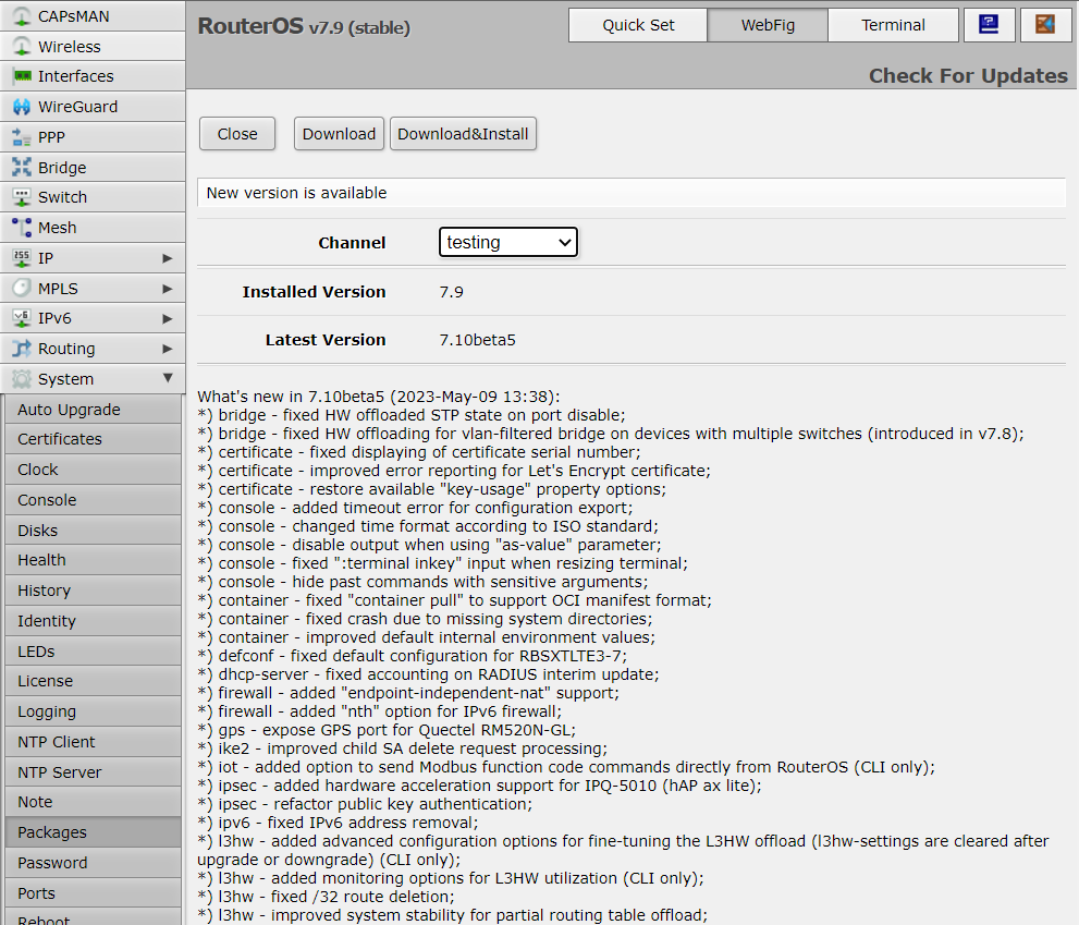 Функция обновления пакетов подключается к серверам MikroTik и проверяет, есть ли новая версия RouterOS под выбранным каналом выпуска. Можно использовать и понижение версии, например, если сейчас используется стабильный релиз, а сменили канал на long-term.